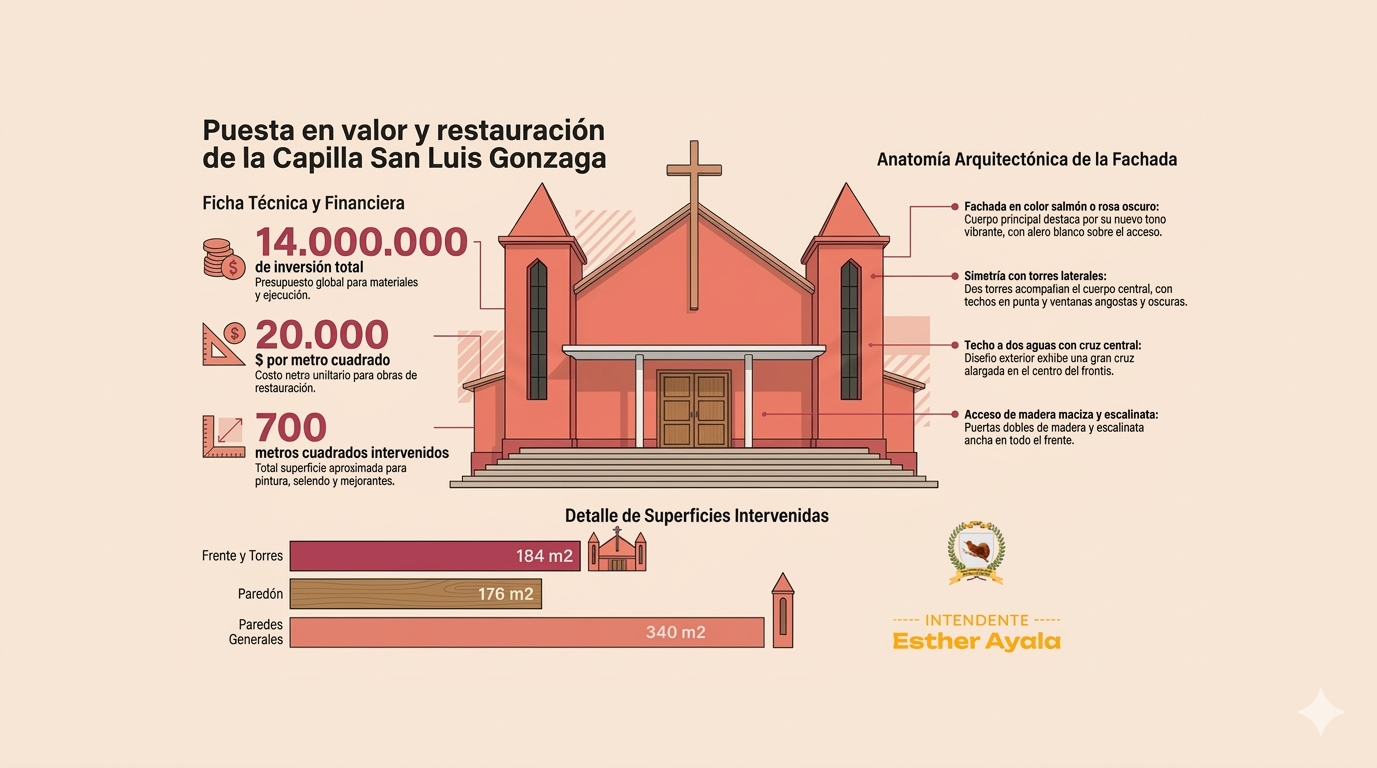 La Municipalidad informa a los vecinos la culminación exitosa de las obras de puesta en valor de la Capilla San Luis Gonzaga. Fieles al compromiso con la transparencia y la administración responsable de los recursos de todos, detallamos los trabajos técnicos ejecutados, que consistieron en una restauración estructural profunda de este edificio vital para la contención y la fraternidad de nuestra localidad.